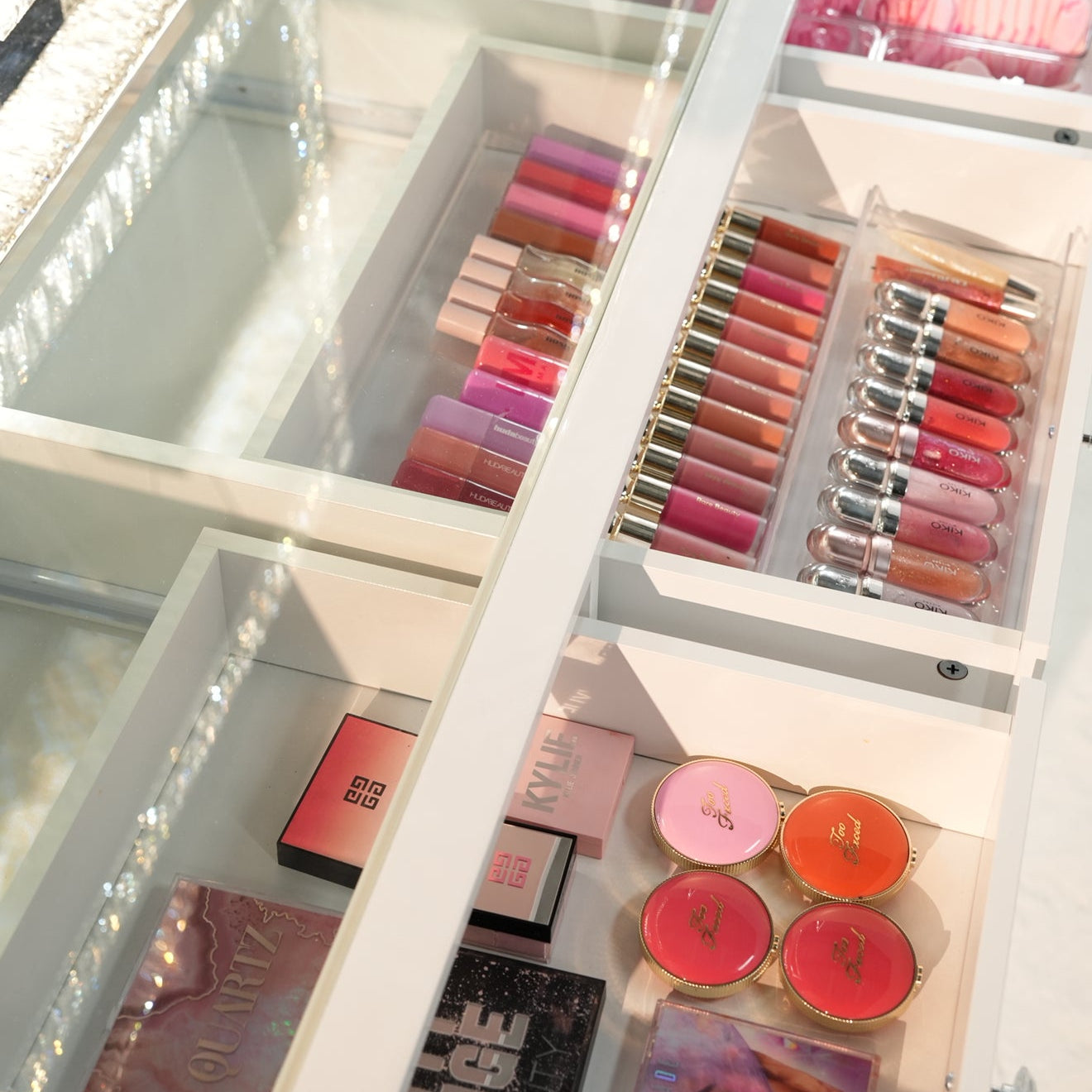 Tiroirs bien conçus : rangements pratiques pour maquillage, pinceaux et bijoux.